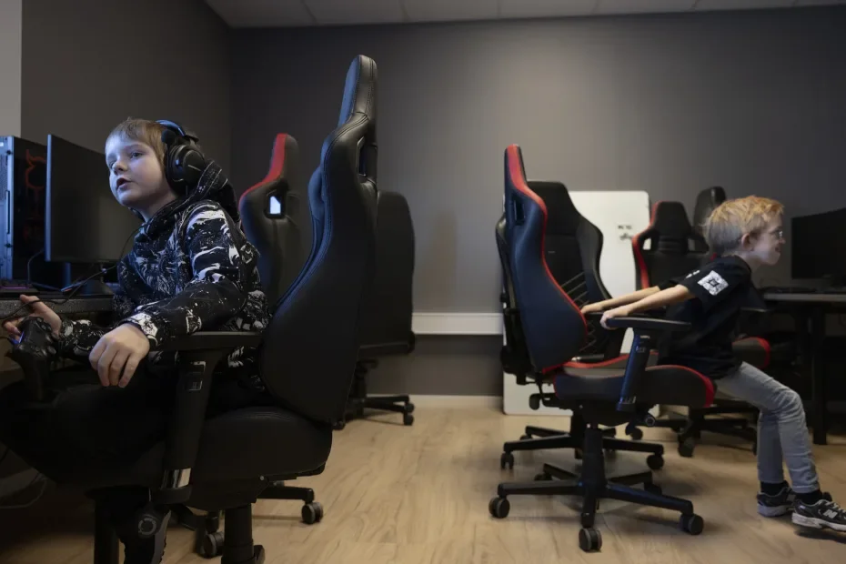 I gamingrummet i det tilstødende lokale er niårige Konrad ved at falde ned af stolen af grin. Han spiller et spil mod træneren Marcus, hvor de skal vælte hinandens tårne.